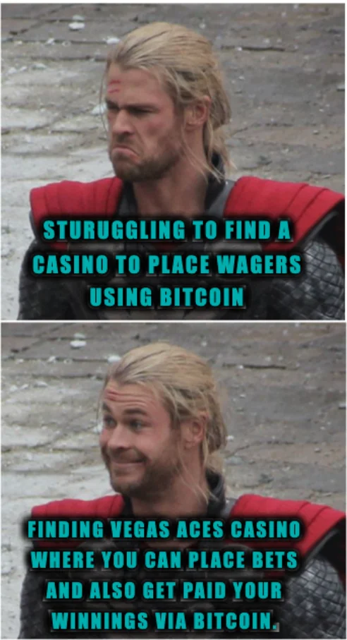 We have used Thor’s expressions to describe a crypto meme that involves wagering at Vegas Aces Casino. You can place bets here using bitcoins and other cryptocurrencies like Ethereum, lite coins, and Bitcoin cash. All your winnings can be paid via Bitcoin as well.